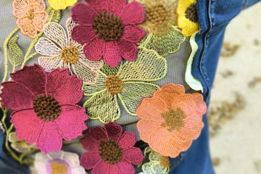 Le principe ? Je découpe le denim avec précision pour y insérer des panneaux de tulle brodé d'exception, sélectionnés avec le même soin que pour mes écharpes. Le résultat, c'est une pièce unique qui mêle le côté décontracté et intemporel du jean à une touche de poésie et de féminité absolument irrésistible.