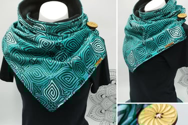 Je choisis soigneusement des tissus originaux, pour offrir un design unique et intemporel à chaque modèle. J'associe à chaque écharpe de boutons en bois gravés par un artisan français — ce petit détail qui fait toute la différence et donne à chaque pièce son caractère bien à elle. La doublure en polaire de qualité garantit une chaleur agréable et un confort optimal pour les journées fraîches.